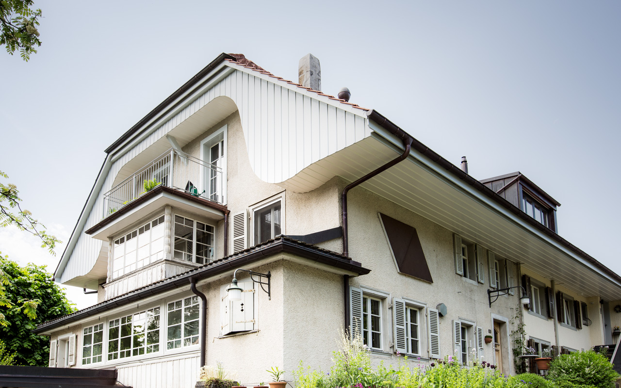 Das über 100 Jährige Haus steht in Kontrast zur modern ausgebauten Dachwohnung