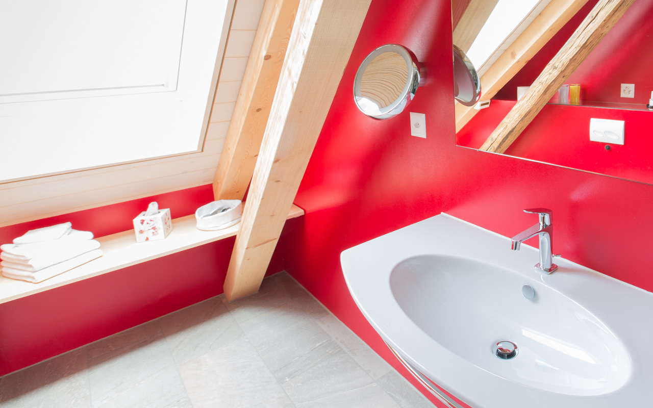 Die grosszügige Dusche, die italienische Keramik und der warme Farbton zaubern gute Laune herbei!