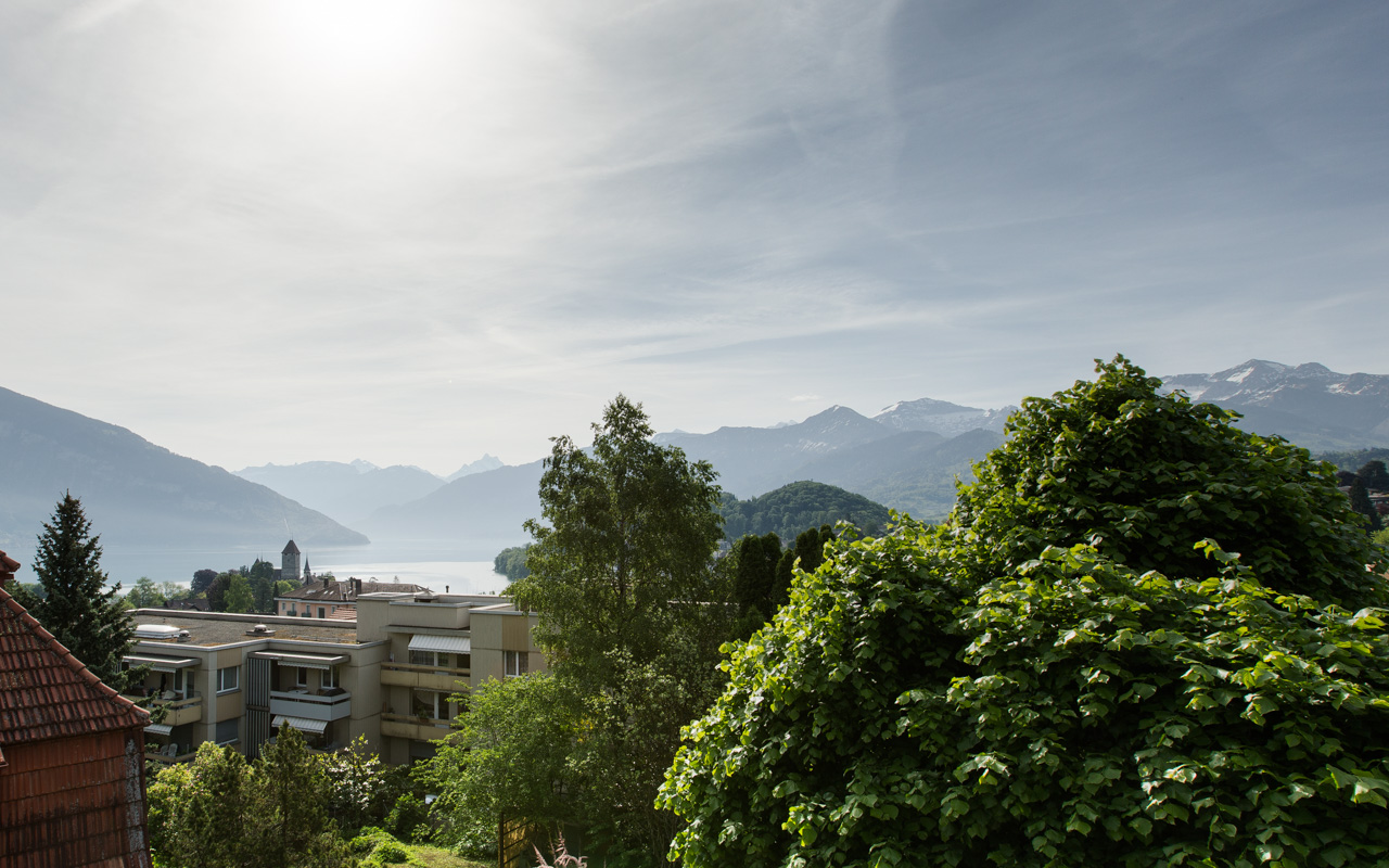 Lo stupendo panorama sul Lago di Thun e le circostanti montagne è un vero elisir per la mente e l’anima e invita a trattenersi sul balcone.